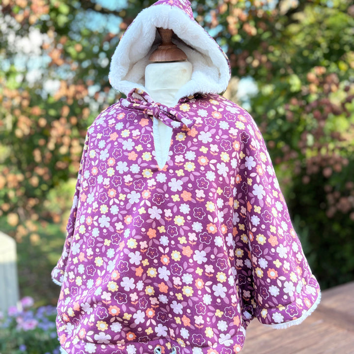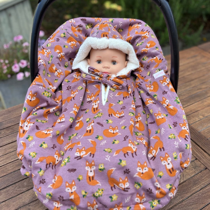 Poncho évolutif bébé motif cachemire violet et rose sur fond gris, capuche en fourrure douce, extérieur jersey molletonné.