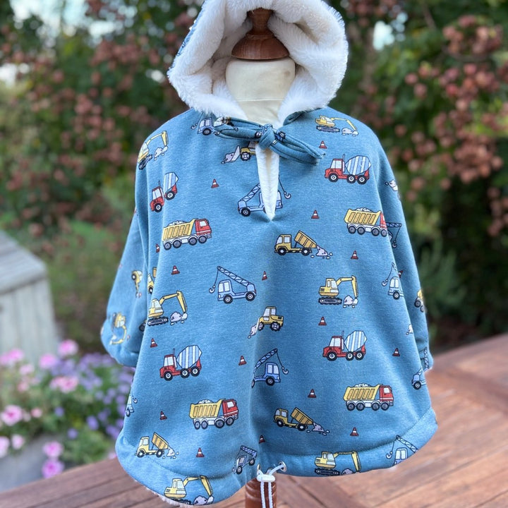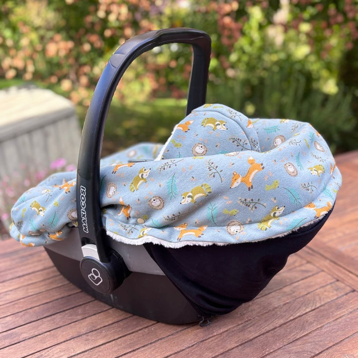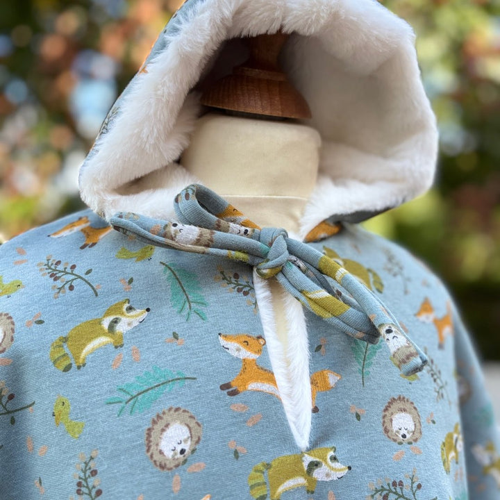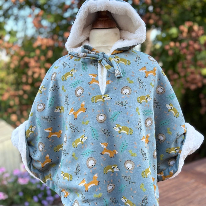 Poncho évolutif bébé motif animaux de la forêt sur fond bleu, coton et doublure polaire chaude